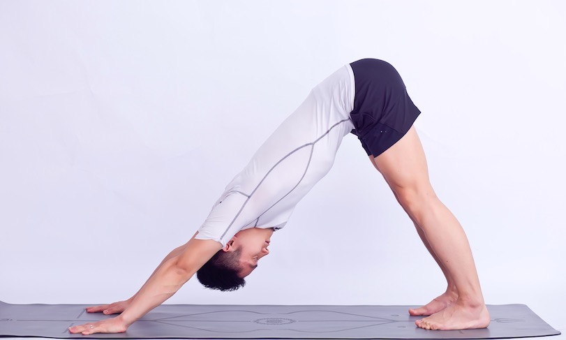 2.身体前倾,两手置于肩下方,两臂、大腿垂直于地面;脚尖回勾,伸直双膝,臀部上提,脚跟下压。
