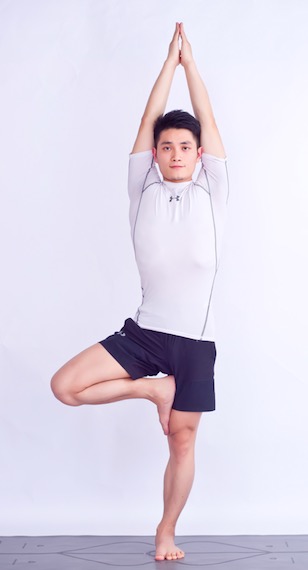 2.屈左膝,将左脚置于右大腿内侧,脚跟靠近会阴、髋外展,双手合掌于胸前,或伸展至头顶上方;目视前方。