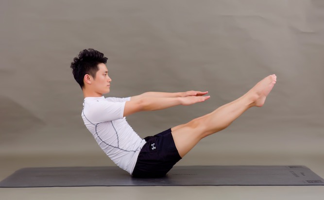 2.双手、双脚和躯干同时上抬,重心放于坐骨,两臂向前伸直平行地面,掌心向下,脊柱延伸,背部展平;目视脚尖方向。