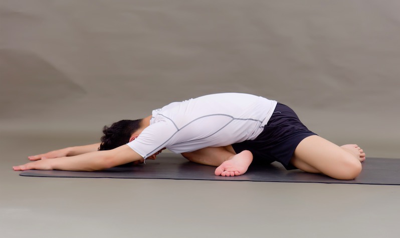 2.屈右膝,脚底贴于左大腿内侧;屈左膝,髋外展,左脚跟贴于臀外侧;身体转向右侧,两臂经两侧举起,向前伸展,两臂放于地面,额头触地。
