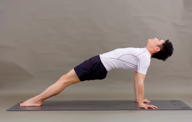 2.两手分开,与肩同宽,置于臀部正后方一掌处,手臂垂支撑于地面,指尖向后;脚掌下压撑地,将臀部抬起与身体保持一直线上;目视上方。