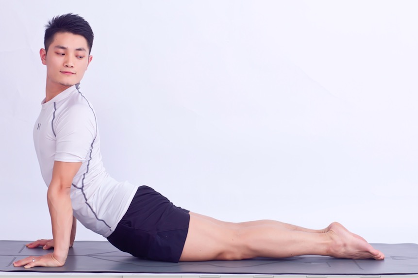 要点:耻骨以下贴地;扭转头颈、肩部时,身体其他部位保持在原位稳定。腕关节有伤者不宜练习。