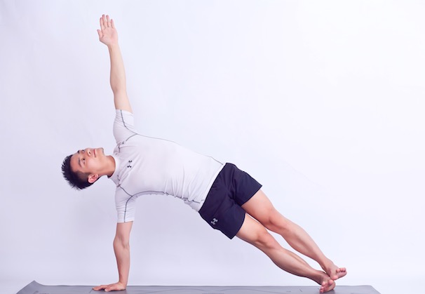 2.身体前倾,两手置于肩下方,两臂、大腿垂直于地面,两腿依次向后伸直,脚尖点地,身体成一直线;右手移向两手之间,右臂支撑,身体转向左侧,双脚并拢,右脚外侧支撑于地面;同时抬起左臂向上,与右臂成一直线垂直于地面;头、颈、脊柱、腿保持在一条直线上,并与髋在同一平面;目视前方。