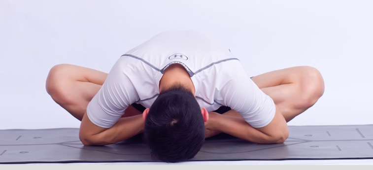(2)屈双膝,脚掌相合,脚跟靠近会阴,十指交叉抓握脚背,大腿外旋,双膝下沉;脊柱伸展,身体前屈,双肘平放地面,额头触地,坐骨下沉。