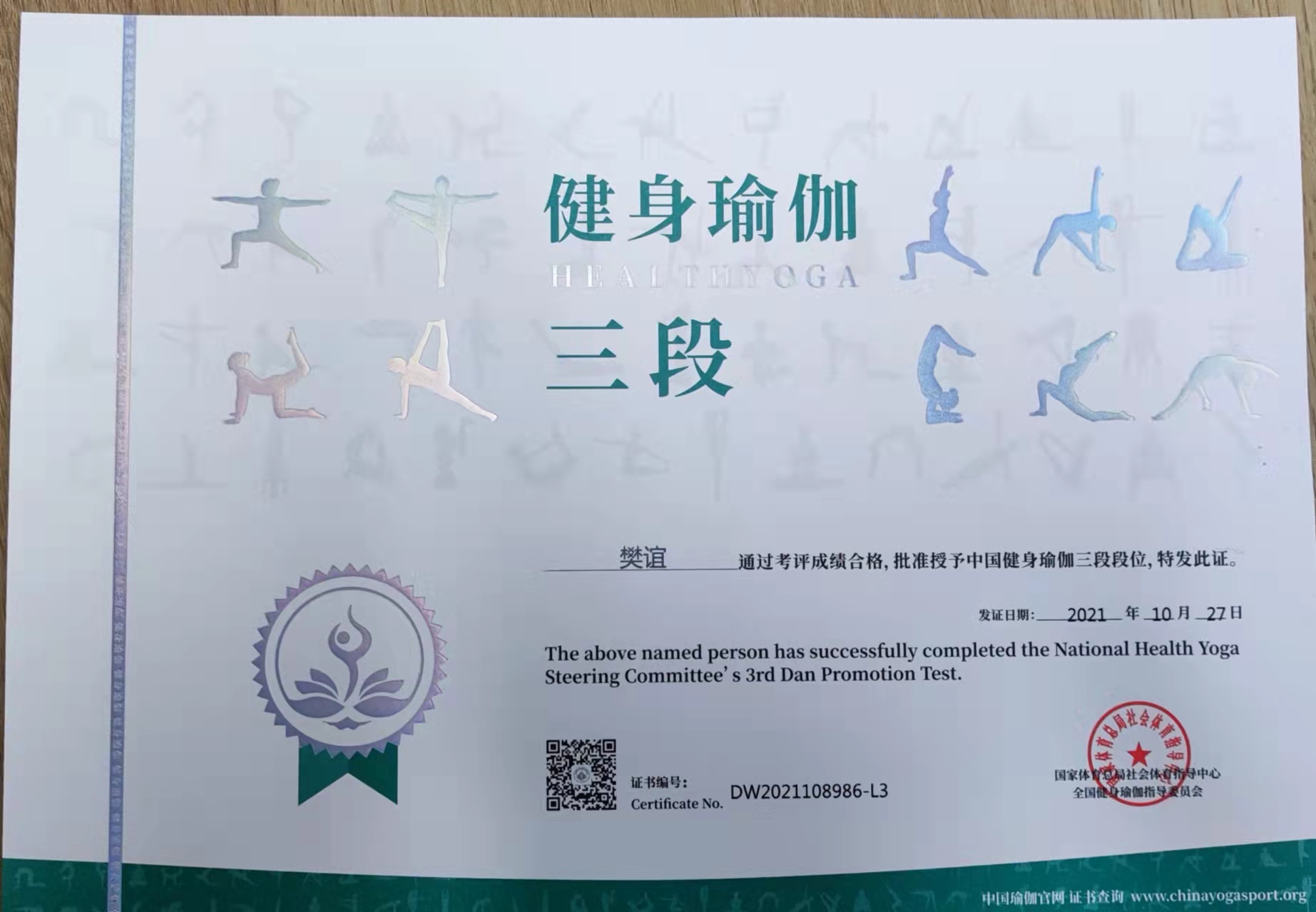 祝贺樊谊在西安薄珈梵歌五星级场馆考评荣获国家体育总局健身瑜伽三段段位