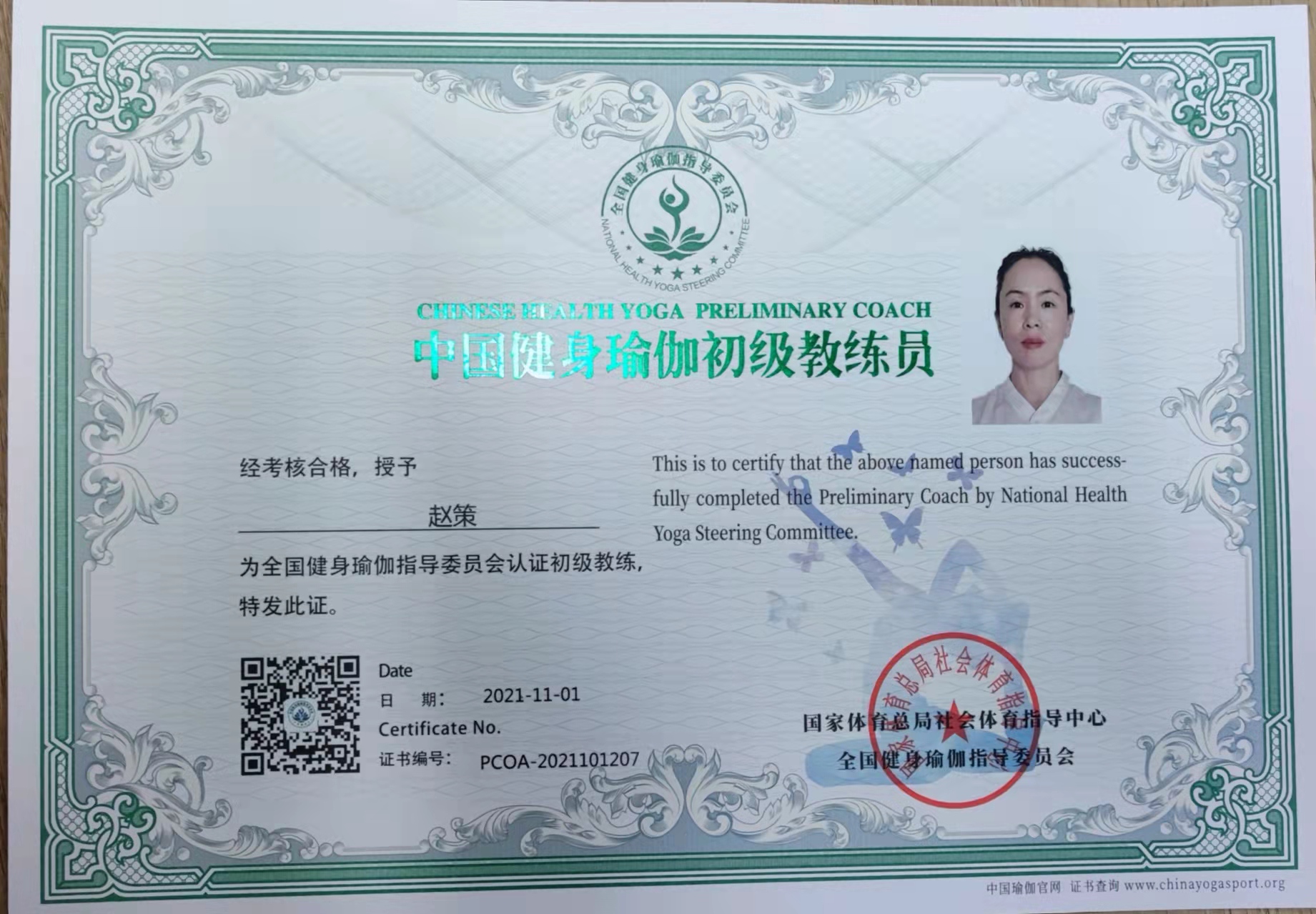 赵策中国健身瑜伽初级教练员