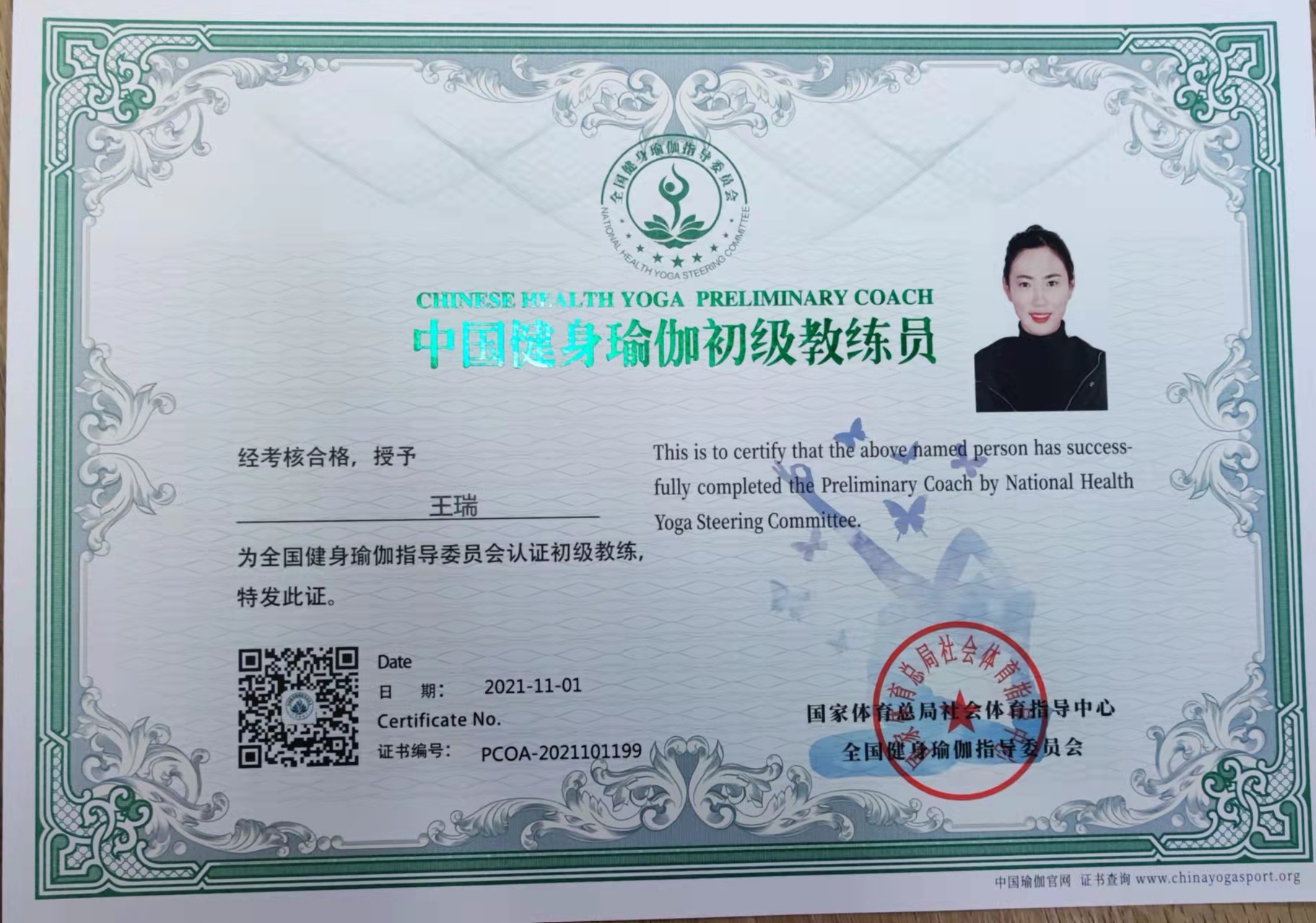 祝贺王瑞在西安薄珈梵歌五星级场馆考评荣获国家体育总局健身瑜伽初级教练员资质