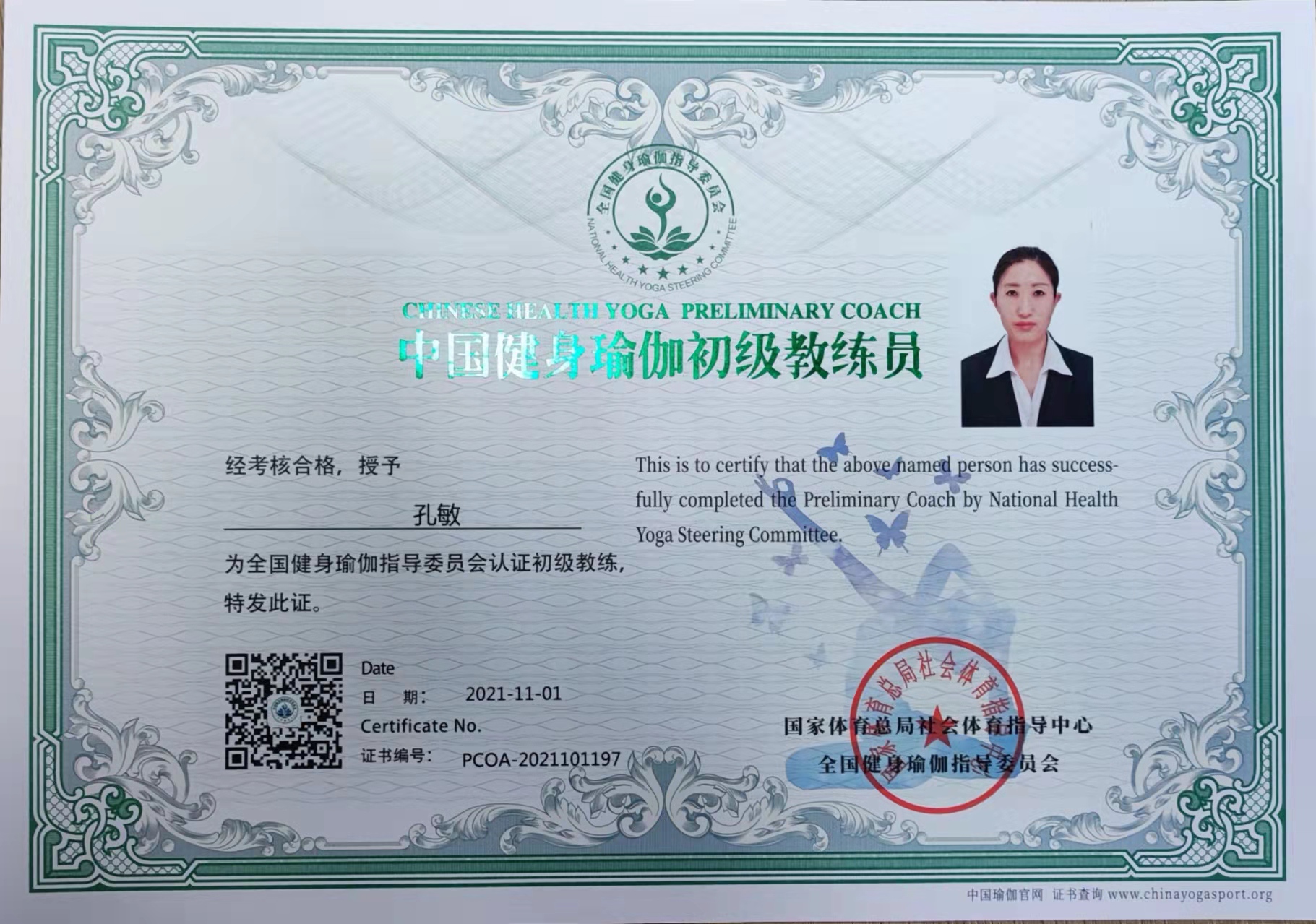 祝贺孔敏在西安薄珈梵歌五星级场馆考评荣获国家体育总局健身瑜伽初级教练员资质