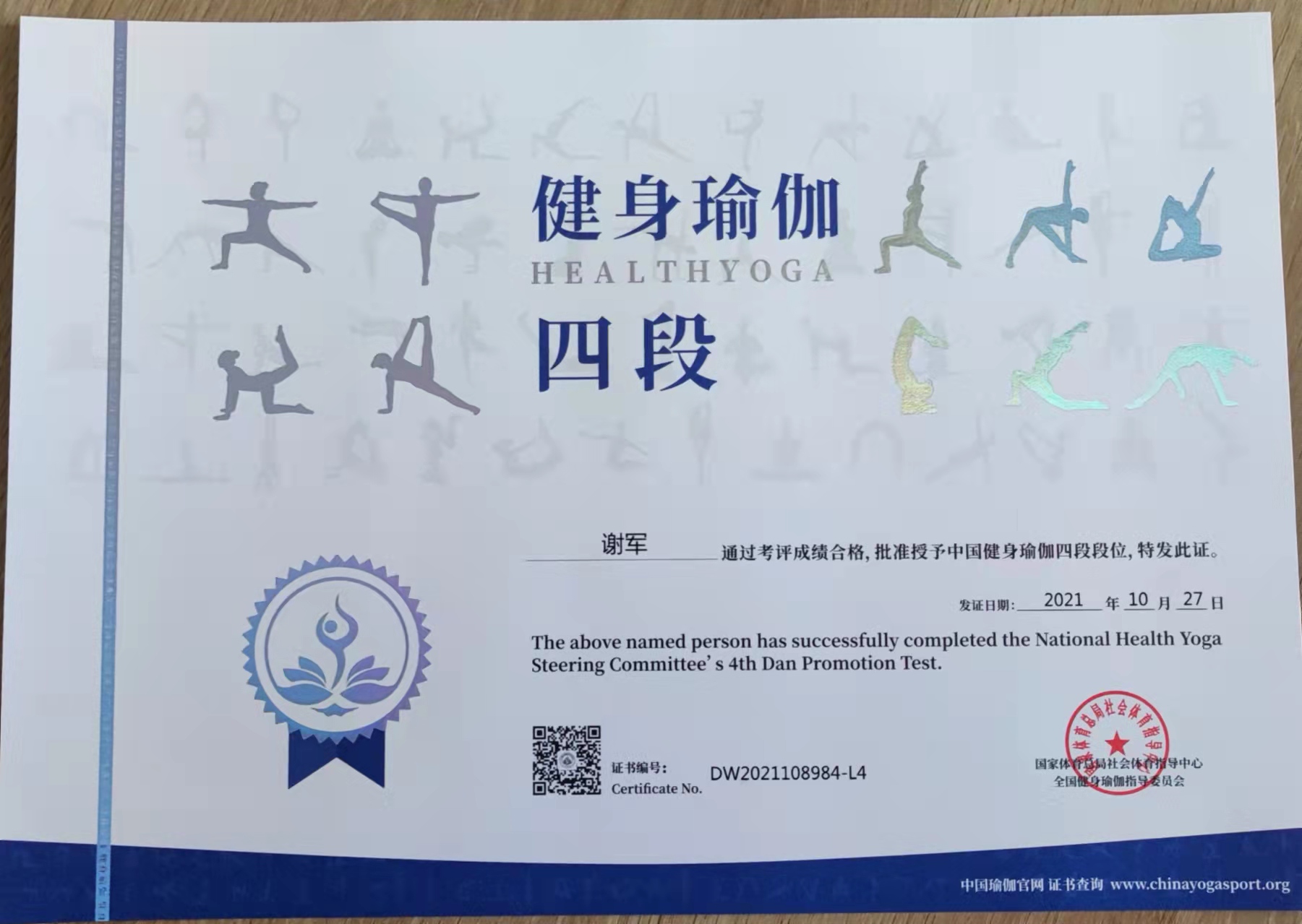 祝贺谢军在西安薄珈梵歌五星级场馆考评荣获国家体育总局健身瑜伽四段段位