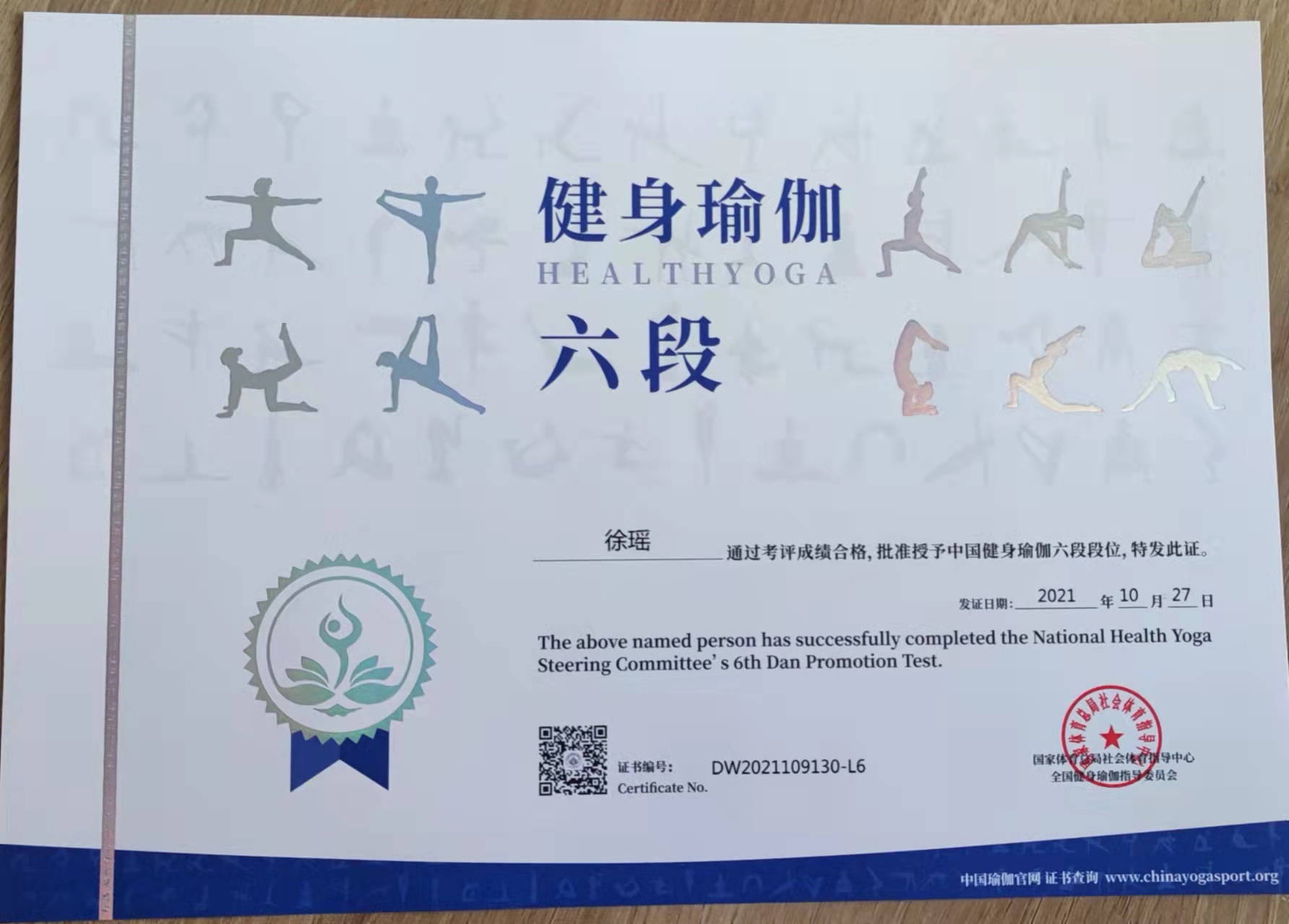 祝贺徐瑶在西安薄珈梵歌五星级场馆考评荣获国家体育总局健身瑜伽六段段位