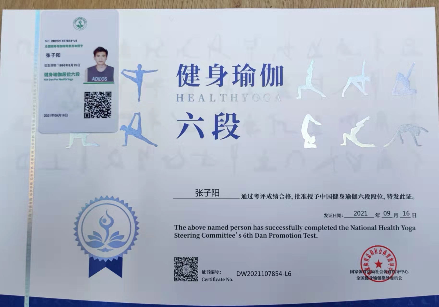 祝贺张子阳在西安薄珈梵歌五星级场馆考评荣获国家体育总局健身瑜伽六段段位