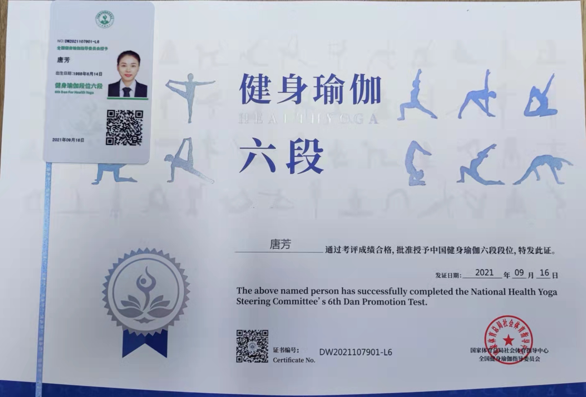祝贺唐芳在西安薄珈梵歌五星级场馆考评荣获国家体育总局健身瑜伽六段段位
