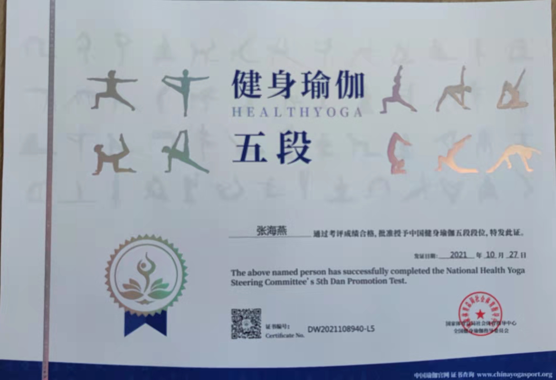 祝贺张海燕在西安薄珈梵歌五星级场馆考评荣获国家体育总局健身瑜伽五段段位