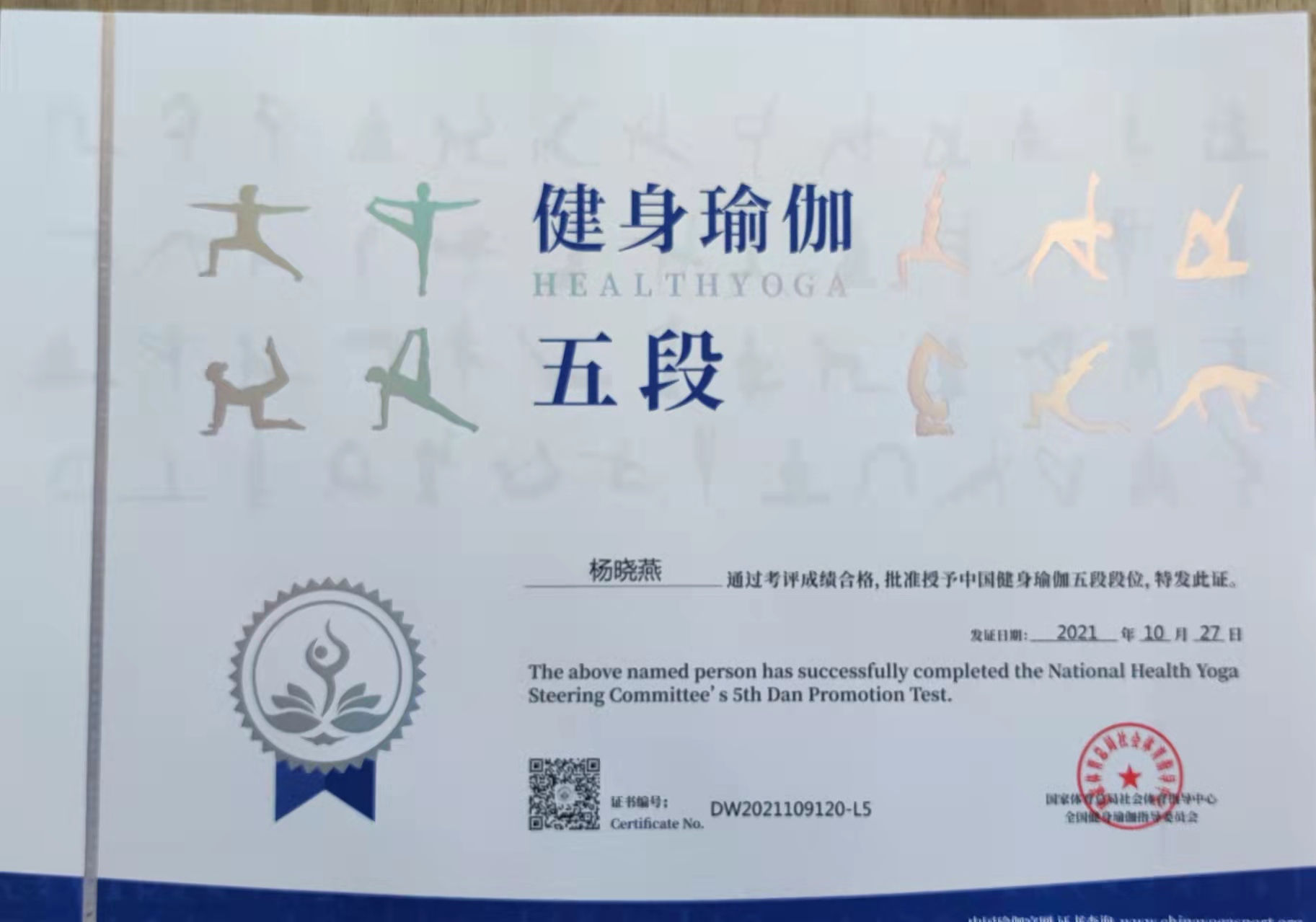 祝贺杨晓燕在西安薄珈梵歌五星级场馆考评荣获国家体育总局健身瑜伽五段段位