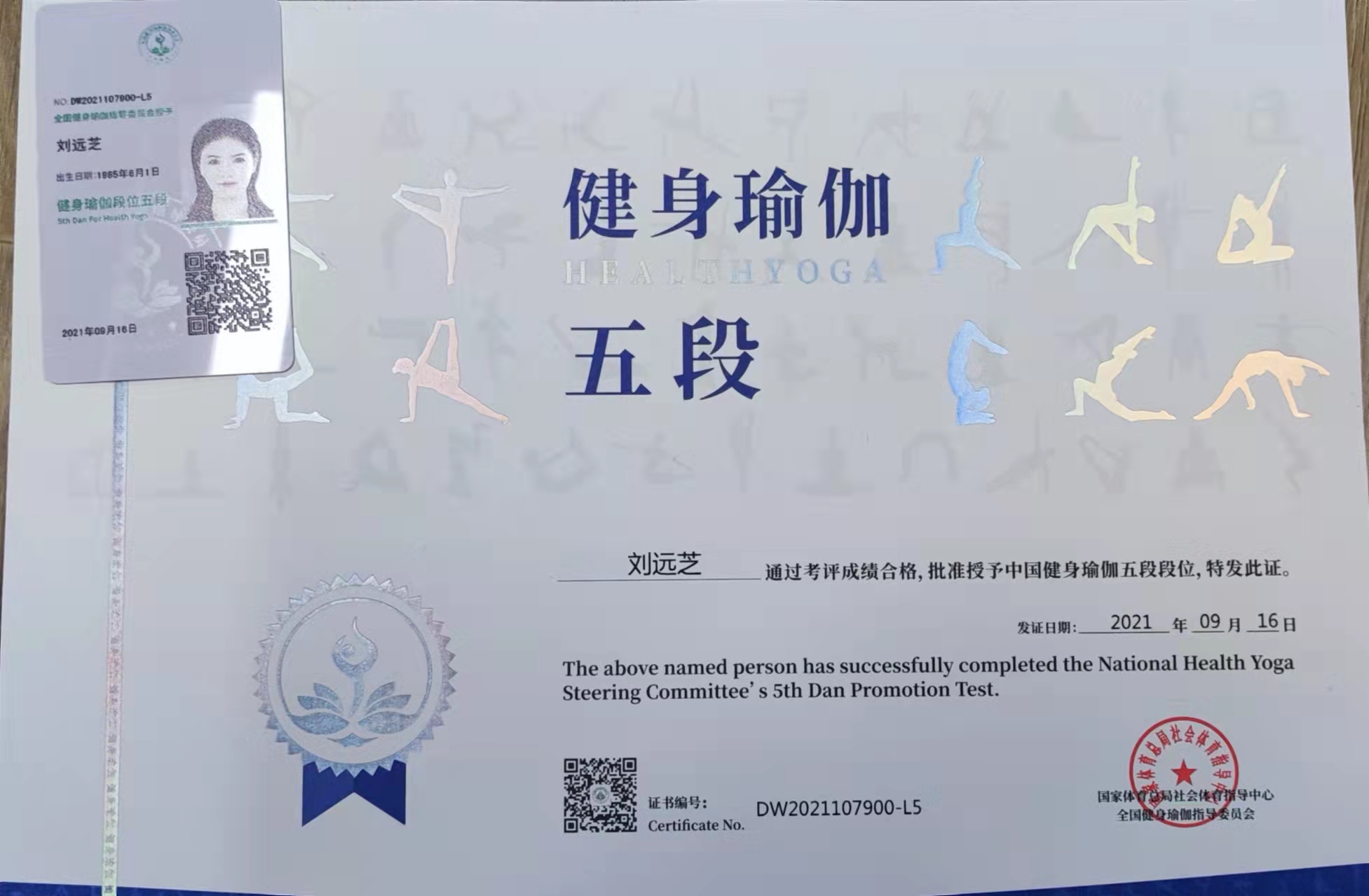 祝贺刘元芝在西安薄珈梵歌五星级场馆考评荣获国家体育总局健身瑜伽五段段位