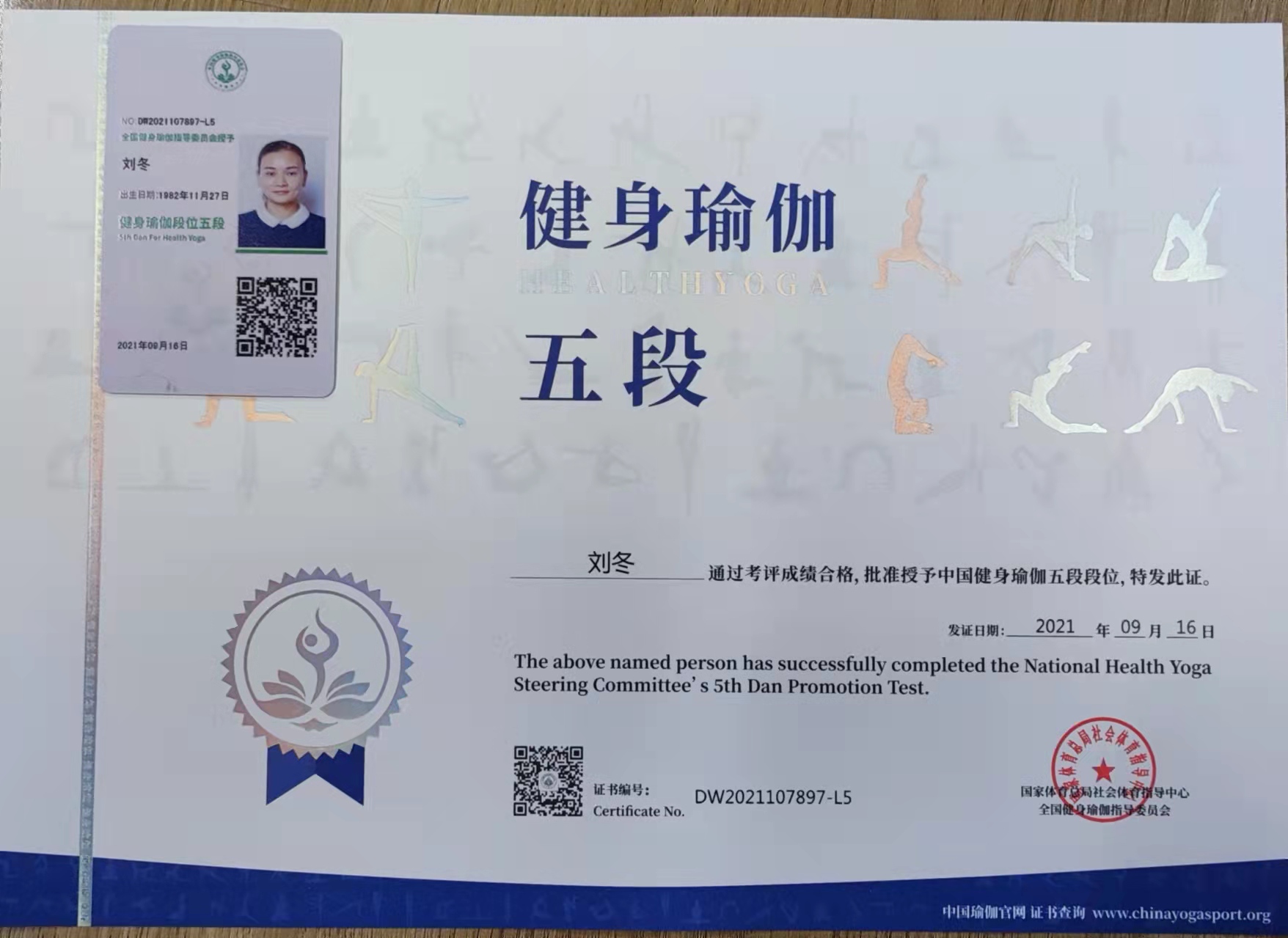 祝贺刘冬在西安薄珈梵歌五星级场馆荣获国家体育总局健身瑜伽五段段位