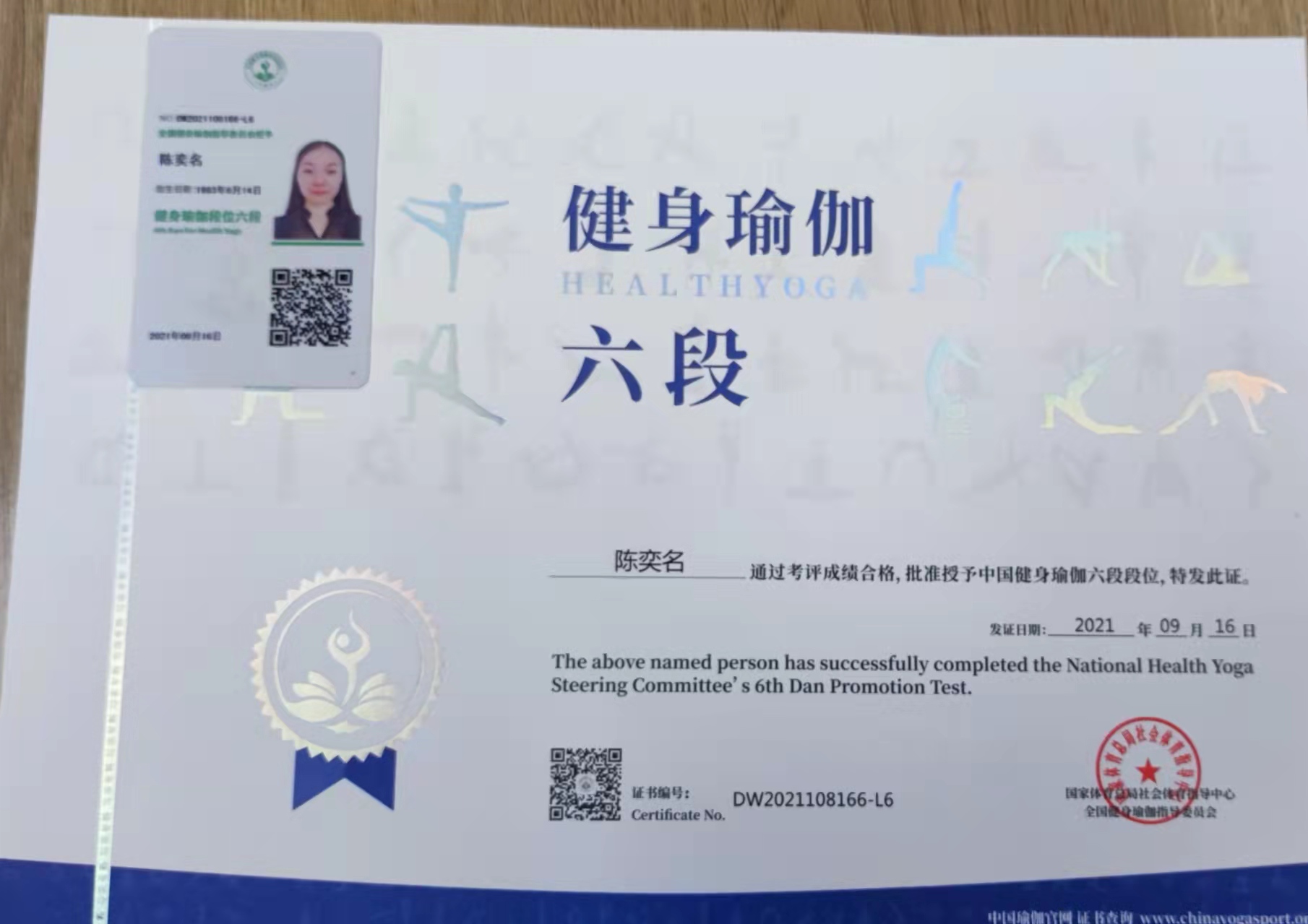 祝贺陈奕名在西安薄珈梵歌五星级场馆荣获国家体育总局健身瑜伽六段段位