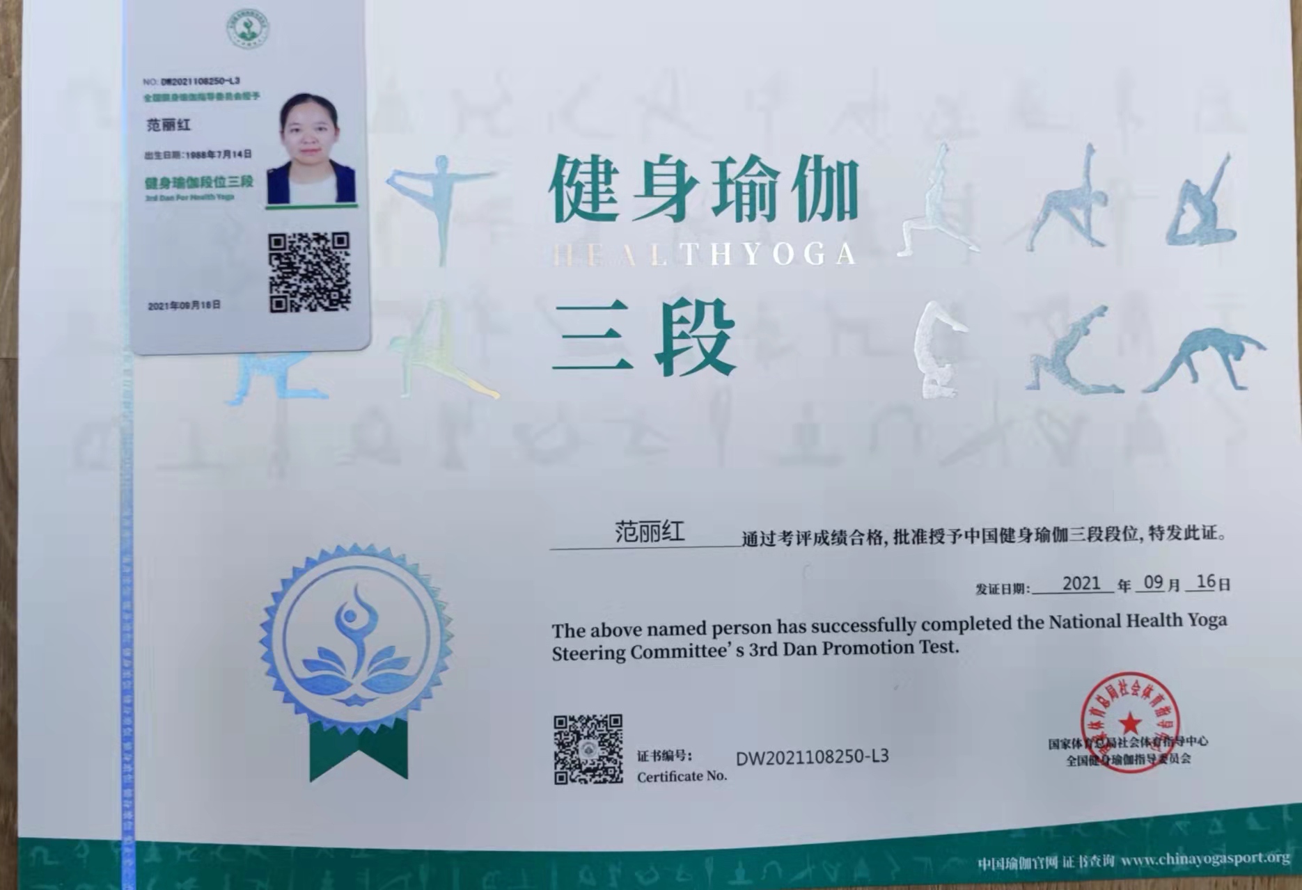 祝贺范丽红在西安薄珈梵歌五星级场馆荣获国家体育总局健身瑜伽三段段位