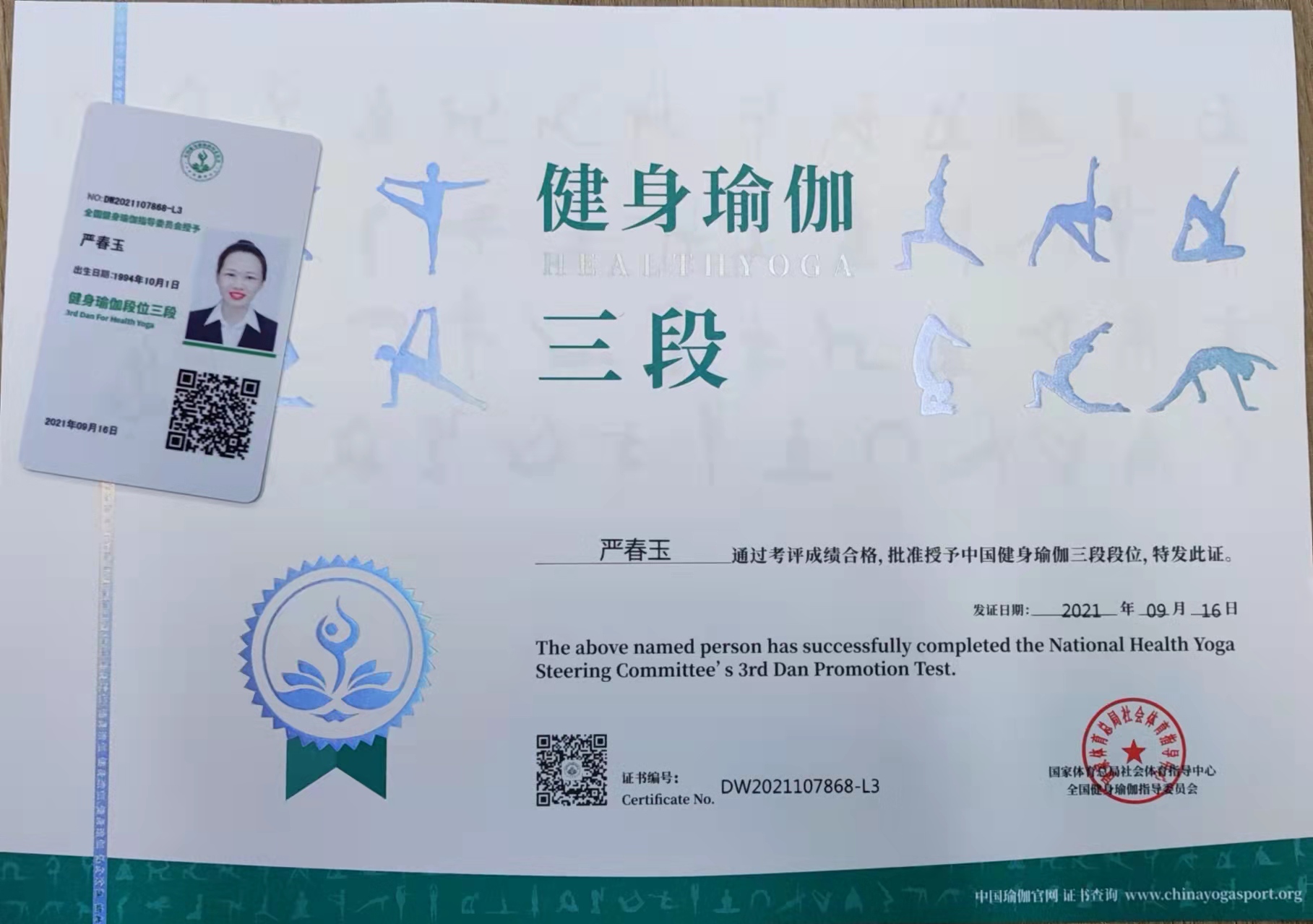 祝贺严春玉在西安薄珈梵歌五星级场馆荣获国家体育总局健身瑜伽三段段位