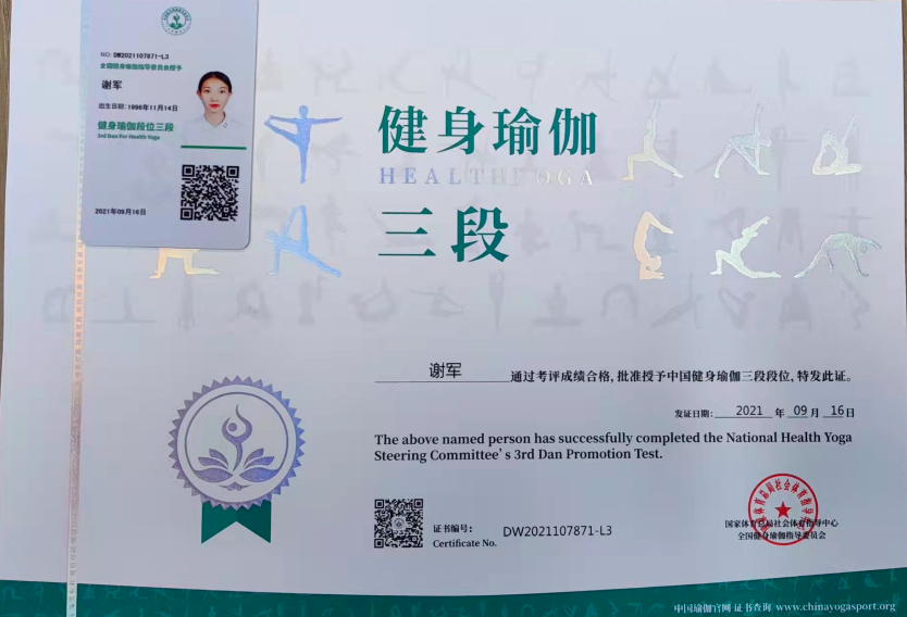 祝贺谢军在西安薄珈梵歌五星级场馆荣获国家体育总局健身瑜伽三段段位