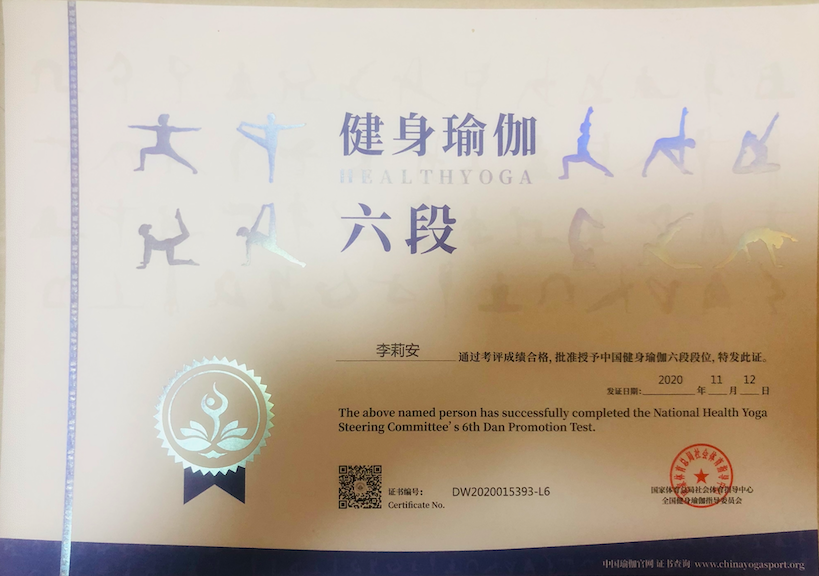 祝贺李莉安在西安薄珈梵歌五星级场馆荣获国家体育总局健身瑜伽六段段位