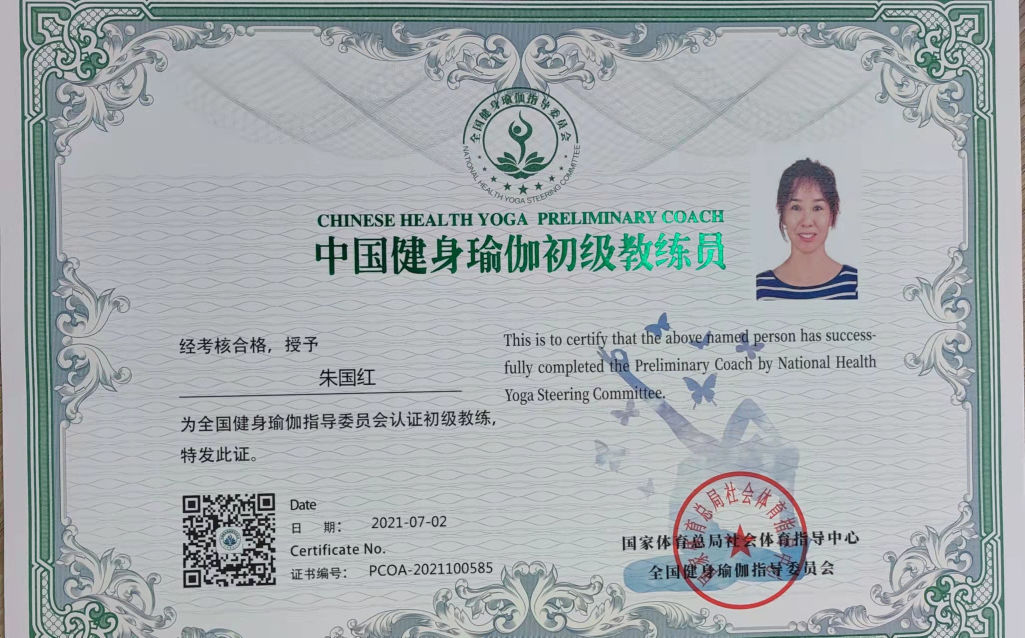 祝贺朱国红在西安薄珈梵歌五星级场馆荣获国家体育总局健身瑜伽初级教练员