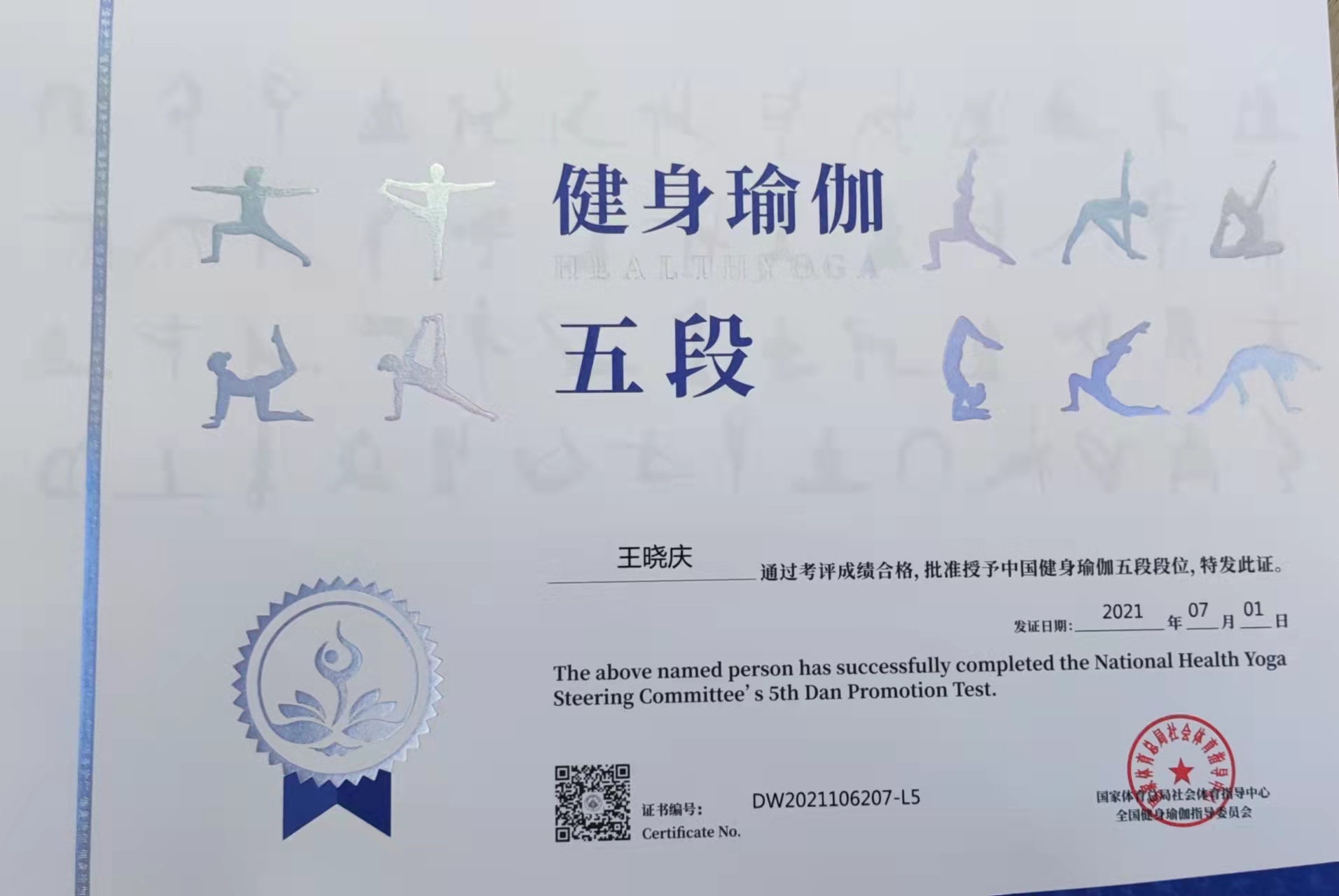 祝贺王晓庆在西安薄珈梵歌五星级场馆荣获国家体育总局健身瑜伽五段段位