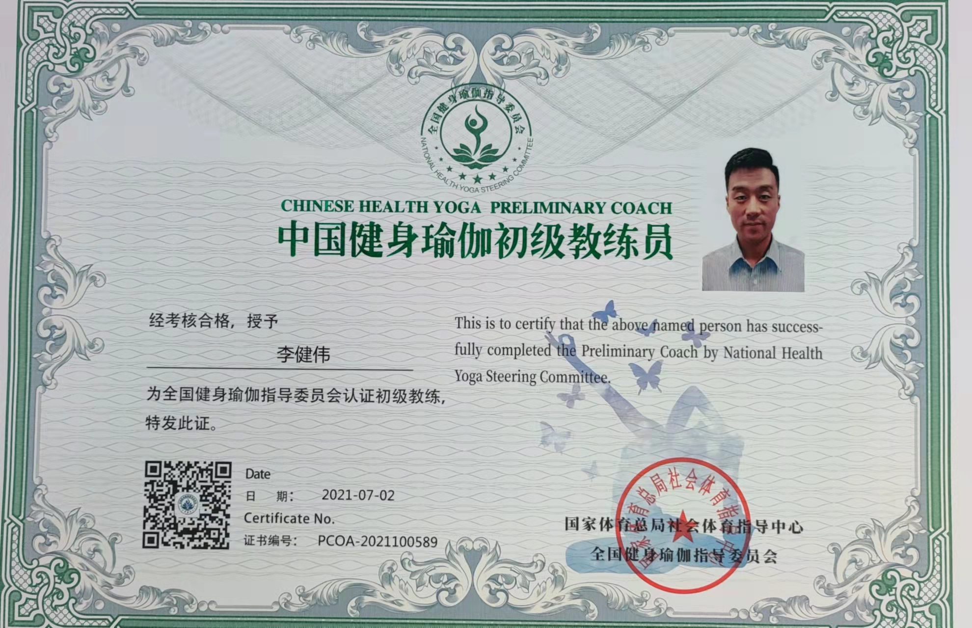 李建伟中国健身瑜伽初级教练员