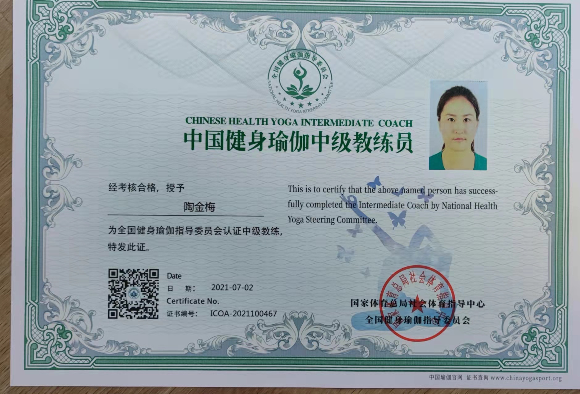 祝贺陶金梅在西安薄珈梵歌五星级场馆荣获国家体育总局健身瑜伽中级教练员