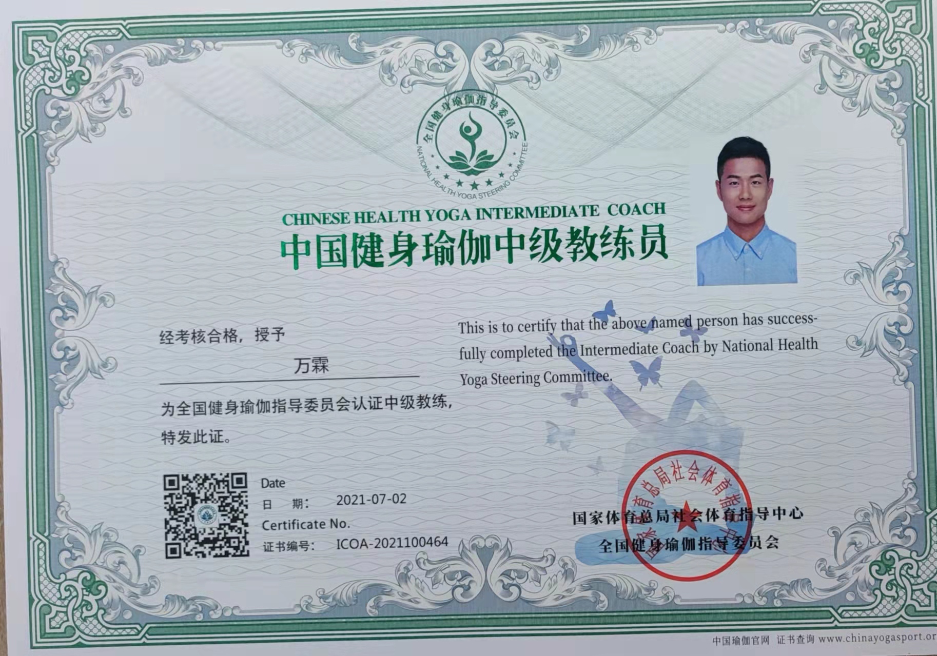 祝贺万霖在西安薄珈梵歌五星级场馆荣获国家体育总局健身瑜伽中级教练员