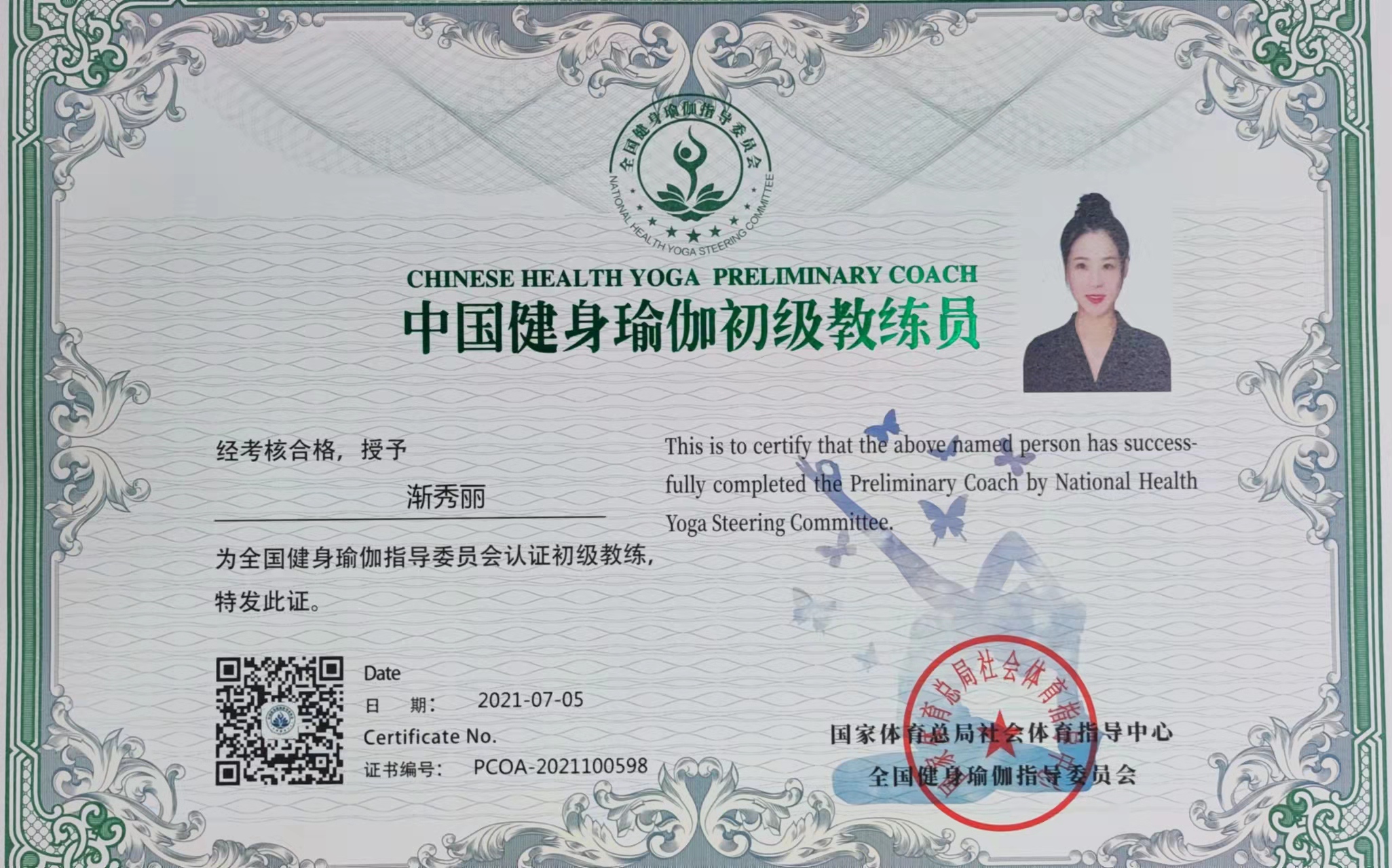 祝贺渐秀丽在西安薄珈梵歌五星级场馆荣获国家体育总局健身瑜伽初级教练员