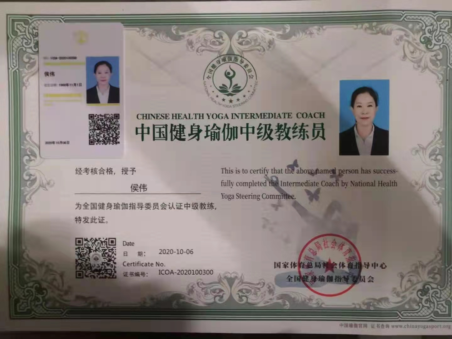 侯伟中国健身瑜伽中级教练员