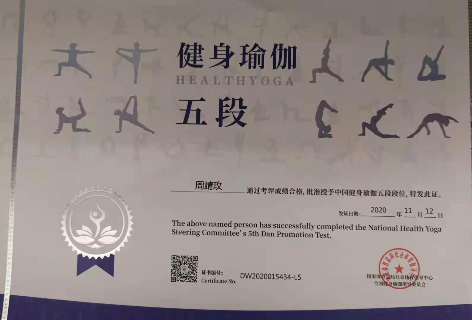 祝贺周靖玫在西安薄珈梵歌五星级场馆荣获国家体育总局健身瑜伽五段段位