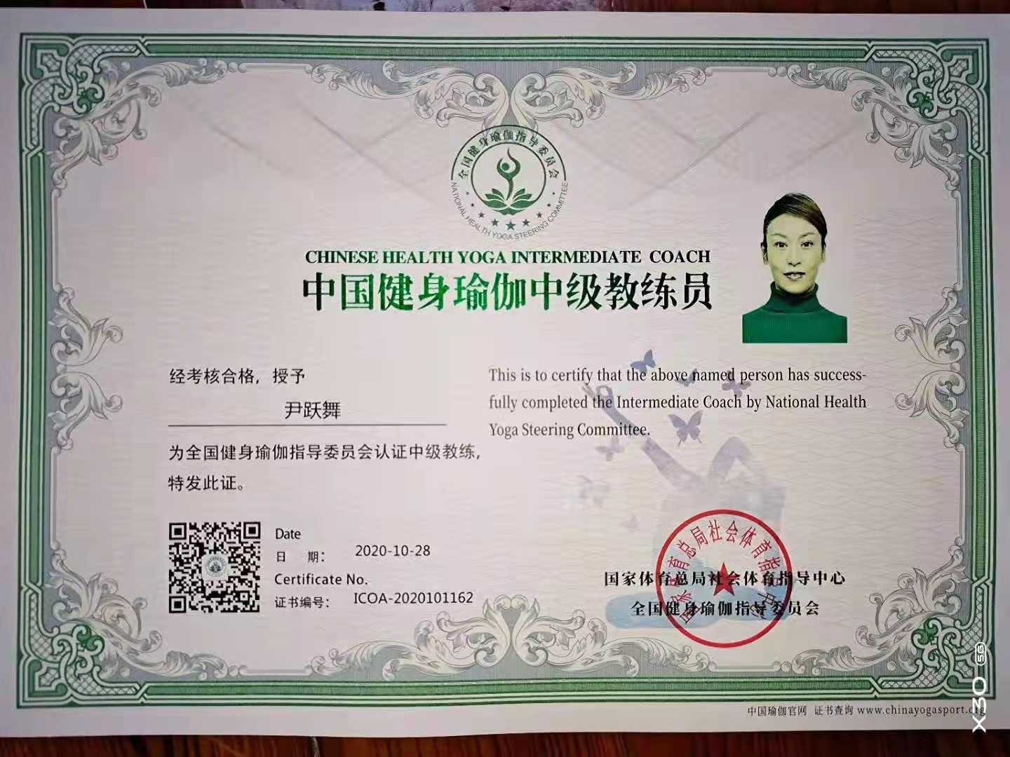 祝贺尹跃舞在西安薄珈梵歌五星级场馆荣获国家体育总局健身瑜伽中级教练员