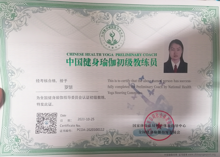 罗慧中国健身瑜伽初级教练员