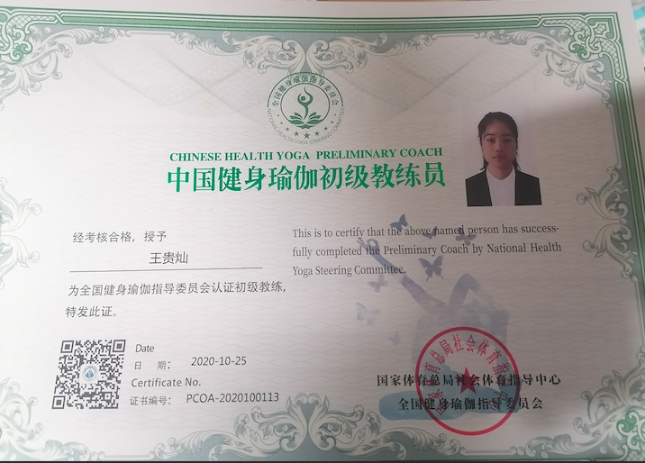 祝贺王贵灿在西安薄珈梵歌五星级场馆荣获国家体育总局健身瑜伽初级教练员