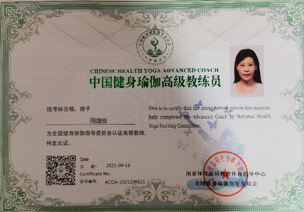 祝贺周靖玫在西安薄珈梵歌五星级场馆荣获国家体育总局健身瑜伽高级教练员