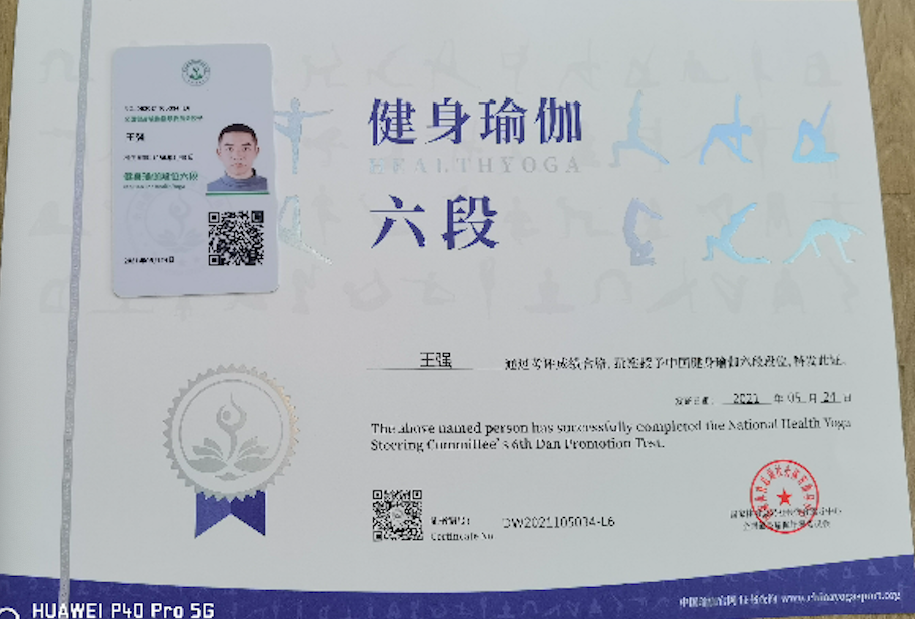 祝贺王强在西安薄珈梵歌五星级场馆荣获国家体育总局健身瑜伽六段段位