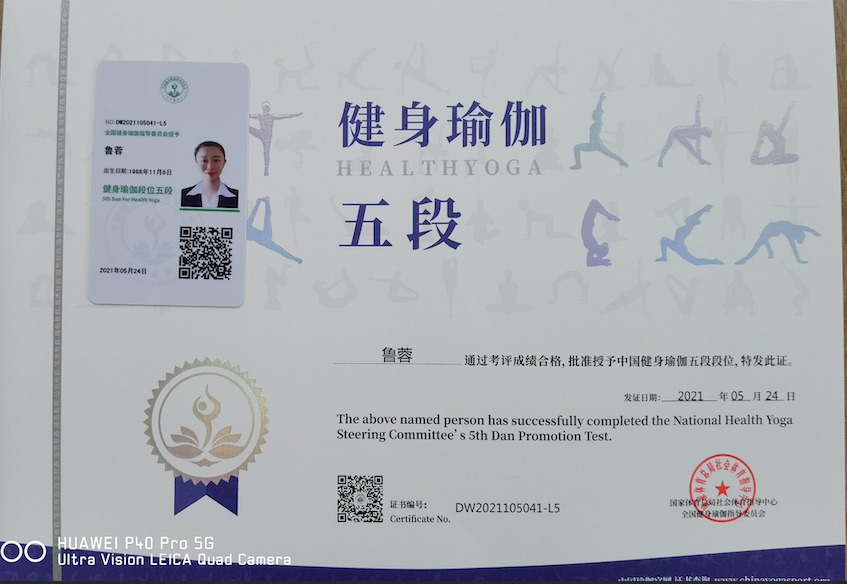 祝贺鲁蓉在西安薄珈梵歌五星级场馆荣获国家体育总局健身瑜伽五段段位