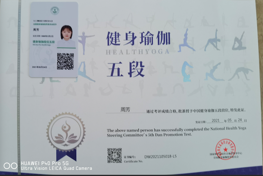 祝贺周芳在西安薄珈梵歌五星级场馆荣获国家体育总局健身瑜伽五段段位