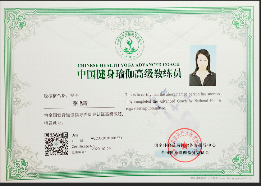 张艳青中国健身瑜伽高级教练员
