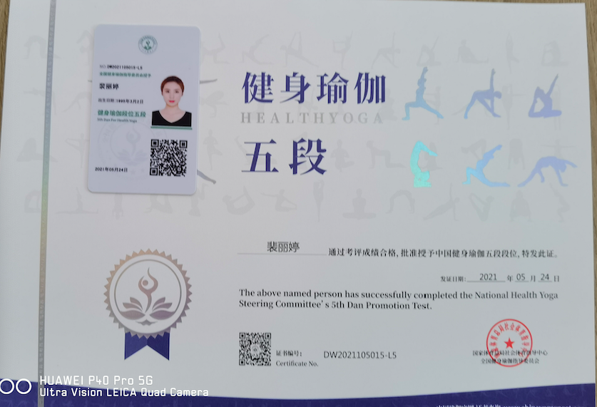 祝贺裴丽婷在西安薄珈梵歌五星级场馆荣获国家体育总局健身瑜伽五段段位