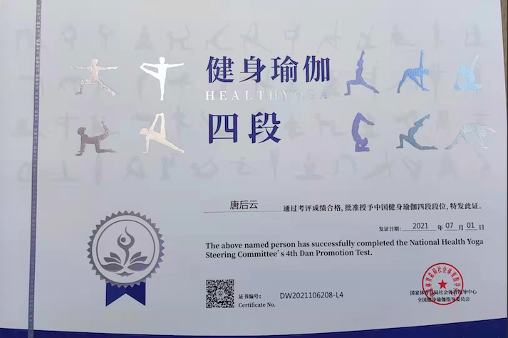 祝贺唐后云在西安薄珈梵歌五星级场馆荣获国家体育总局健身瑜伽四段段位