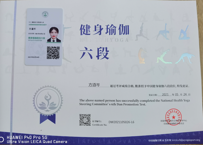 祝贺方道岑在西安薄珈梵歌五星级场馆荣获国家体育总局健身瑜伽六段段位