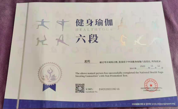 祝贺孟莉在西安薄珈梵歌五星级场馆荣获国家体育总局健身瑜伽六段段位