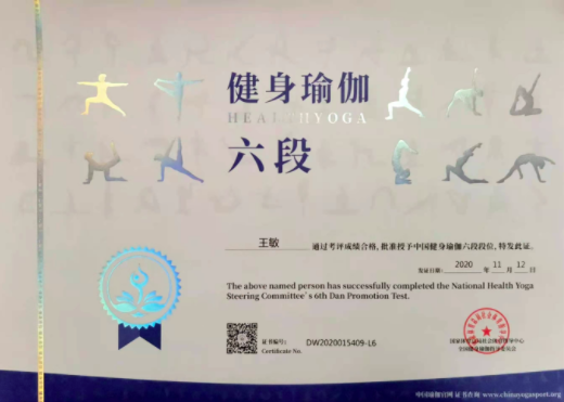 祝贺王敏在西安薄珈梵歌五星级场馆荣获国家体育总局健身瑜伽六段段位