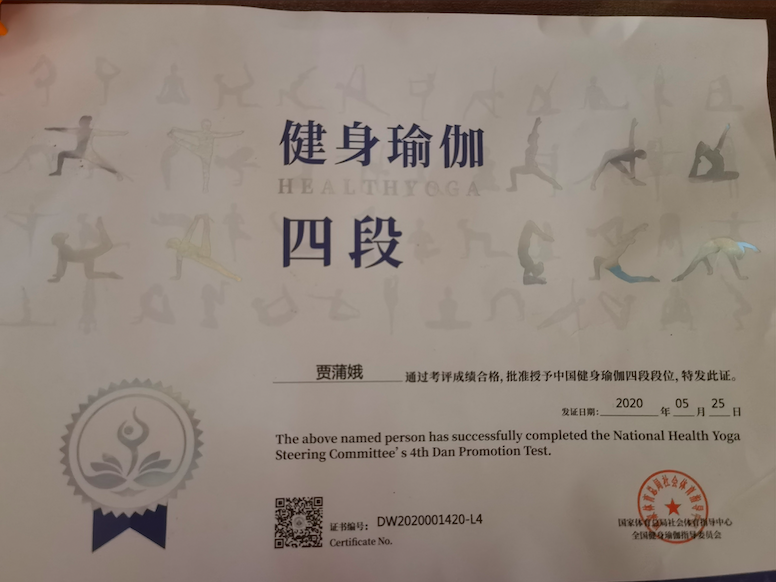 祝贺贾蒲娥在西安薄珈梵歌五星级场馆荣获国家体育总局健身瑜伽四段段位