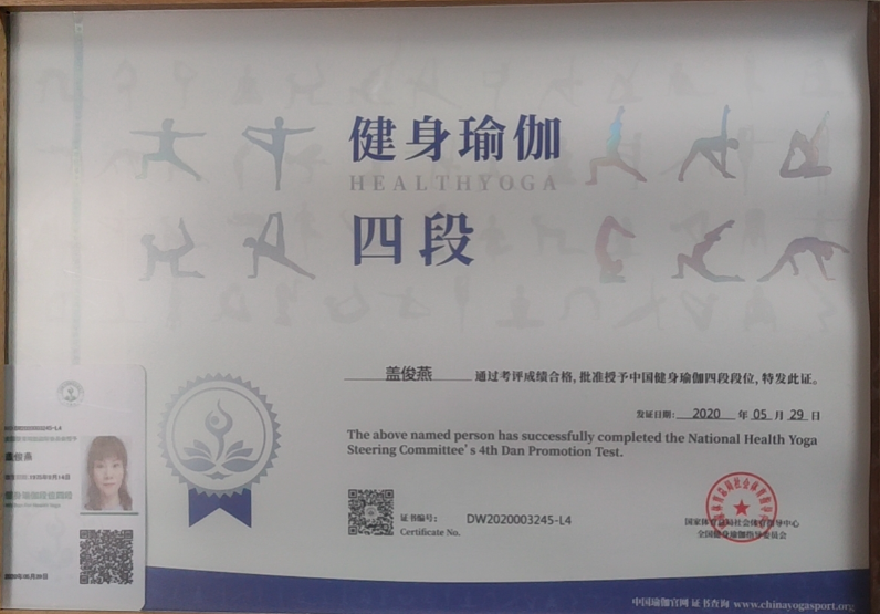 祝贺盖俊燕在西安薄珈梵歌五星级场馆荣获国家体育总局健身瑜伽四段段位
