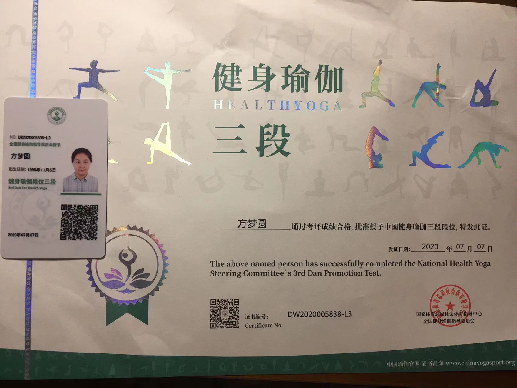 祝贺方梦圆在西安薄珈梵歌五星级场馆荣获国家体育总局健身瑜伽三段段位