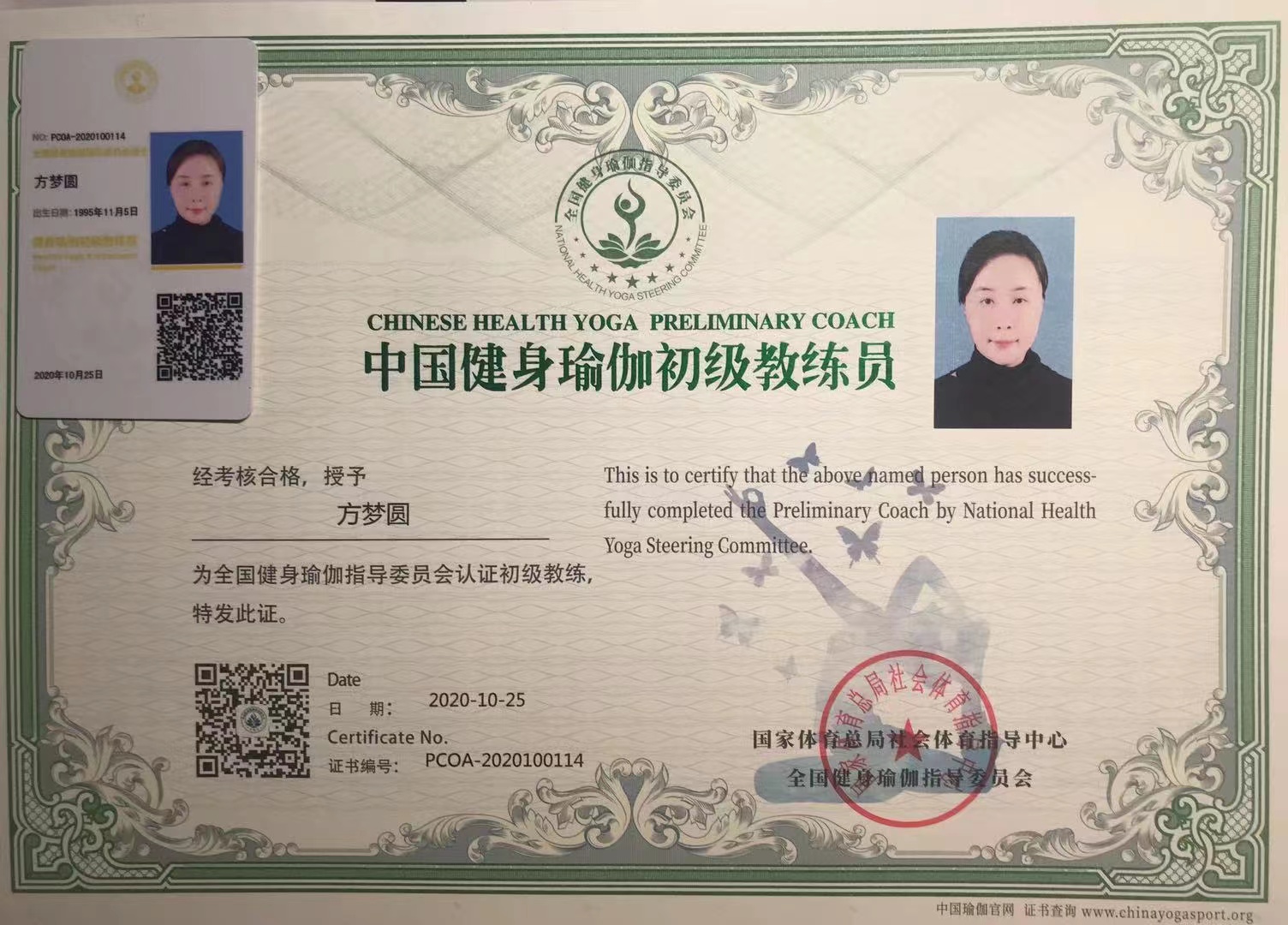 祝贺方梦圆在西安薄珈梵歌五星级场馆荣获国家体育总局健身瑜伽初级教练员